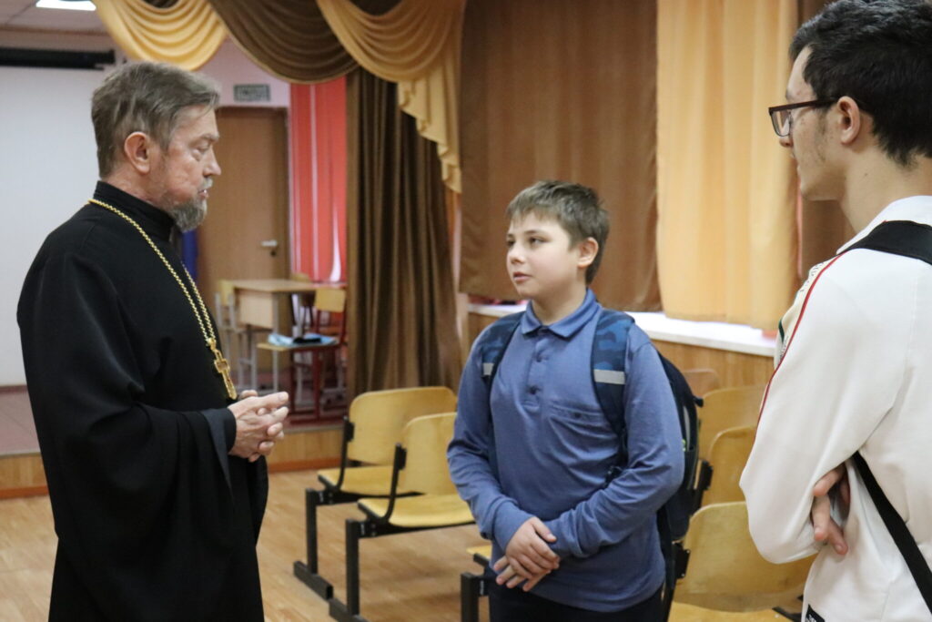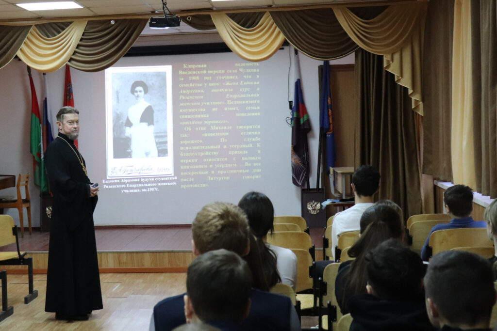 Встреча была построена вокруг рассказа о жизненном пути и мученическом подвиге святого. Отец Андрей поведал школьникам, что Михаил Абрамов родился в 1885 году в простой крестьянской семье в Рязанской губернии, получил духовное образование и прошёл путь от псаломщика до священника. Ребята с интересом рассматривали старинные фотографии храмов, где он служил, и его семьи.