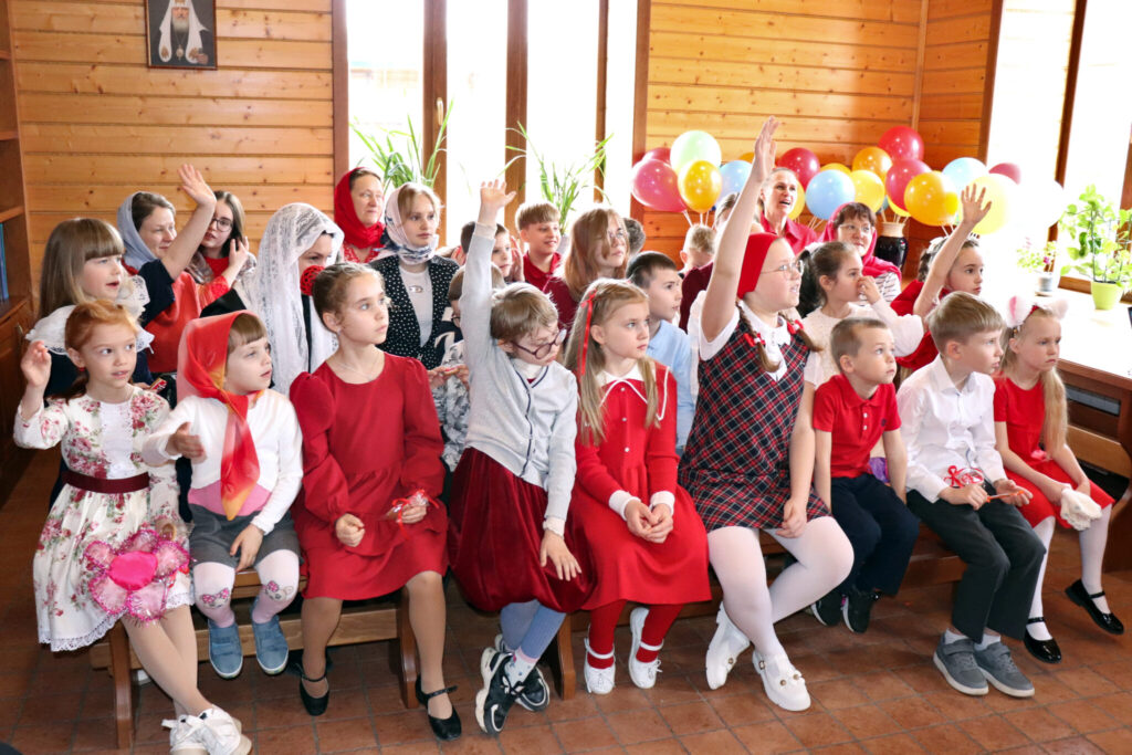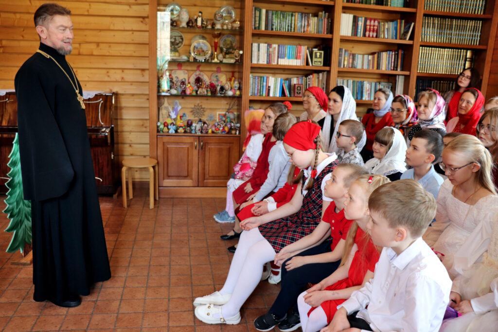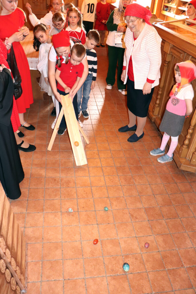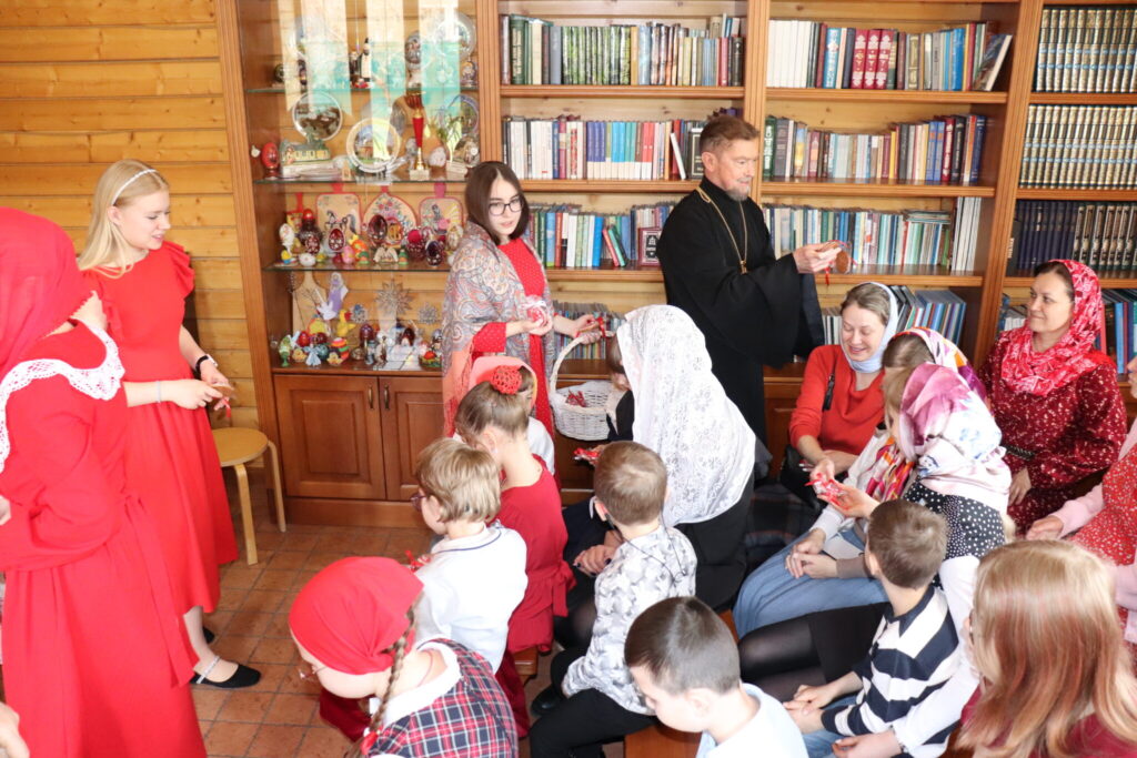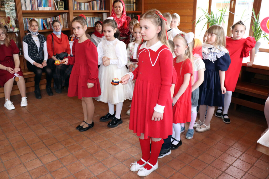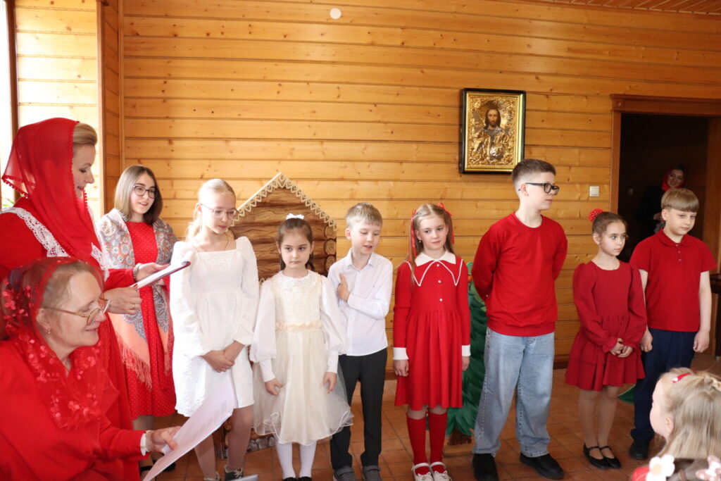Днём воспитанники воскресной школы показали в трапезной музыкальный спектакль «Про Красную Шапочку» — добрую и весёлую историю с новым, пасхальным звучанием. После представления ребят ждали пасхальные игры, викторины и загадки.