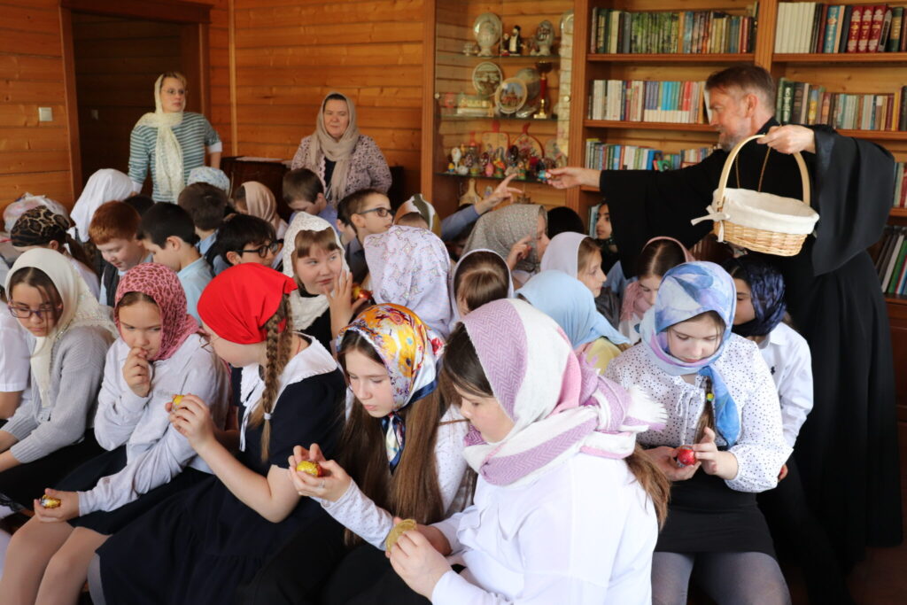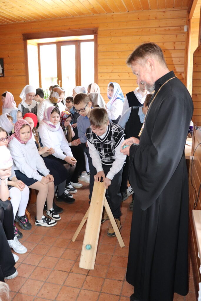 После познавательной беседы настало время для весёлых занятий. Батюшка предложил ребятам сыграть в традиционную пасхальную игру — катание яиц. На специально подготовленной наклонной доске школьники по очереди скатывали деревянные яйца, стараясь попасть в другие яйца, расположенные внизу. Игра пришлась по душе всем ребятам, и даже самые тихие с радостью включились в неё.